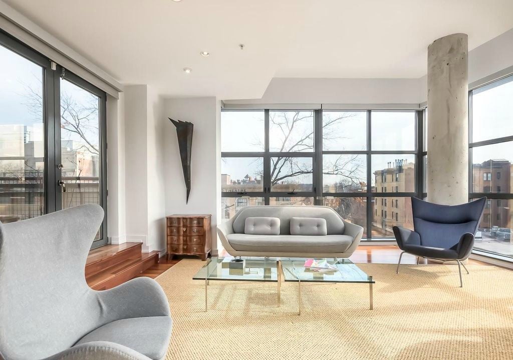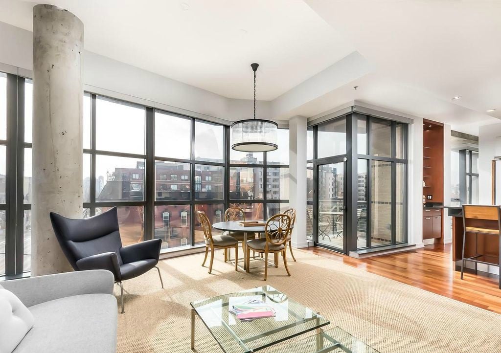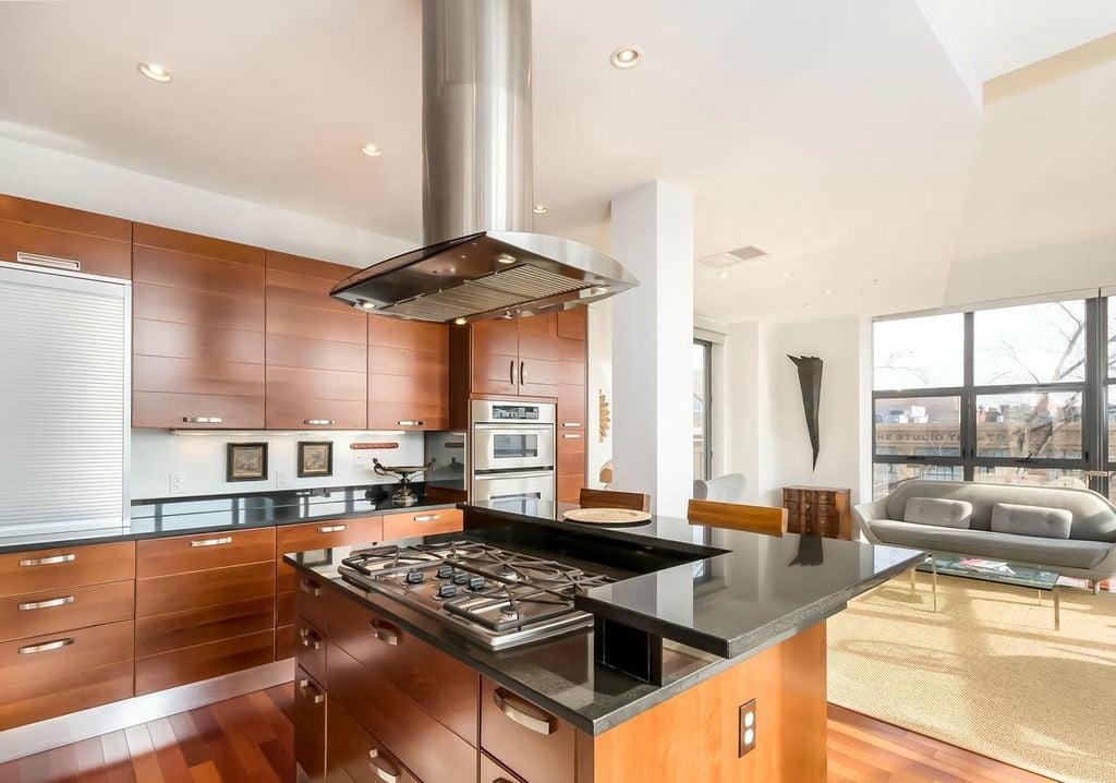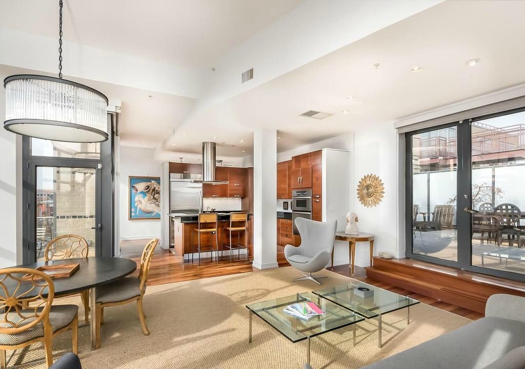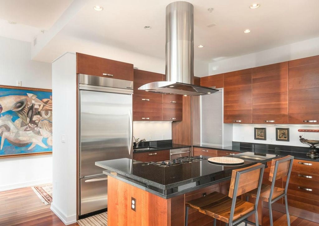 2 bed,2 bathroom, den, 2,150 sf/ 600 sf private terrace/ 2 balconies/ 1 storage unit/ 2 separate. Deeded garage parking spaces* unit: floor-to-ceiling windows, south facing,12 ft ceilings, Brazilian cherry hardwoods, kitchen: granite counters, custom Scavolini cherry custom cabinets, island w/ seating for 3, stainless steel prof appliances. Bath: granite topped Scavolini cherry vanities, marble tiling