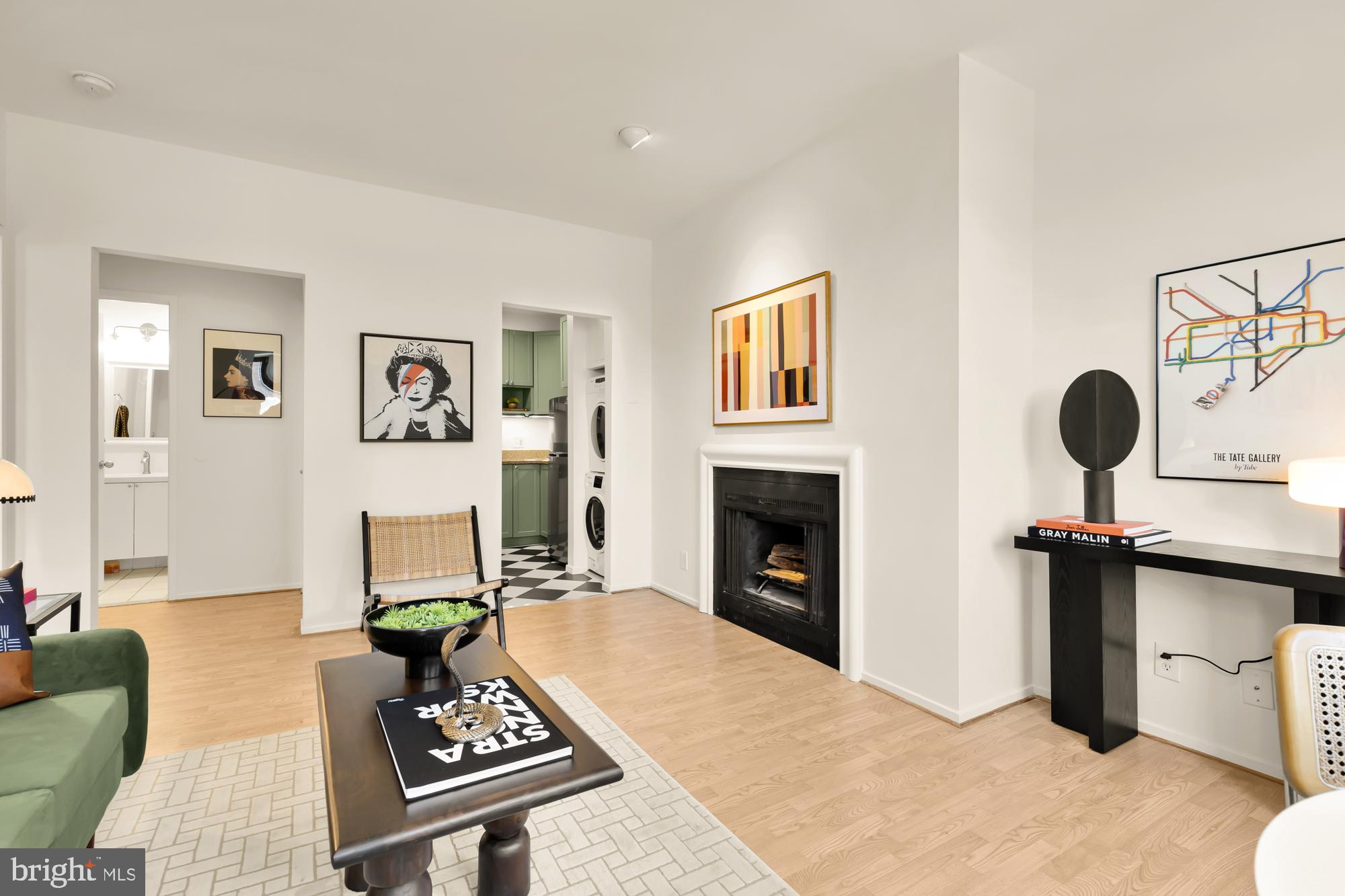 Step inside to discover a bright and airy living area, highlighted by a large oversized bay window that floods the room with natural light and offers charming views of the neighborhood. The space seamlessly connects to a kitchen straight out of your Pinterest dreams, equipped with essential appliances, ample cabinetry, and in-unit washer and dryer. This unit features a distinctive wood-burning fireplace--one of the few in the building--adding a unique touch of warmth and character to your home.