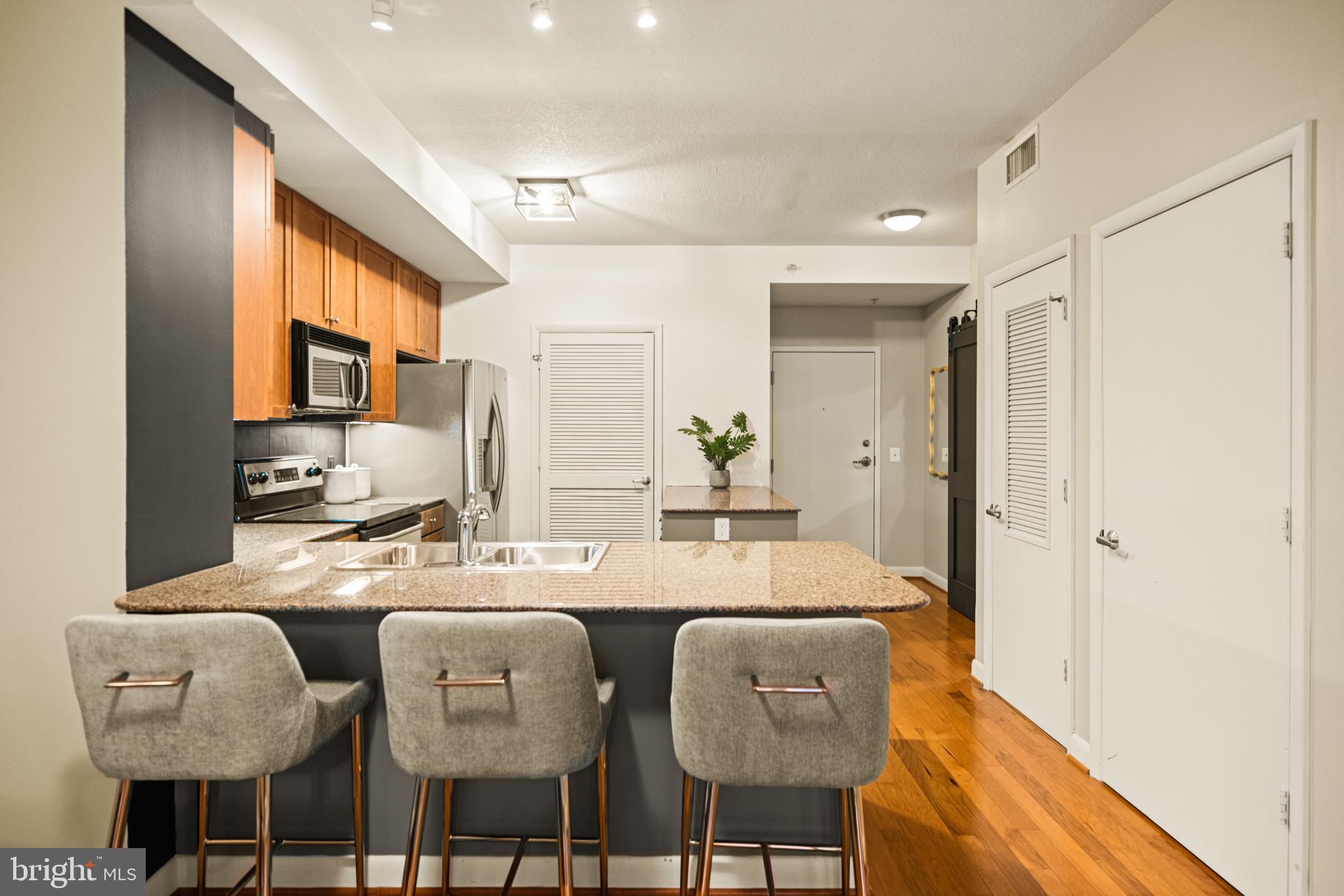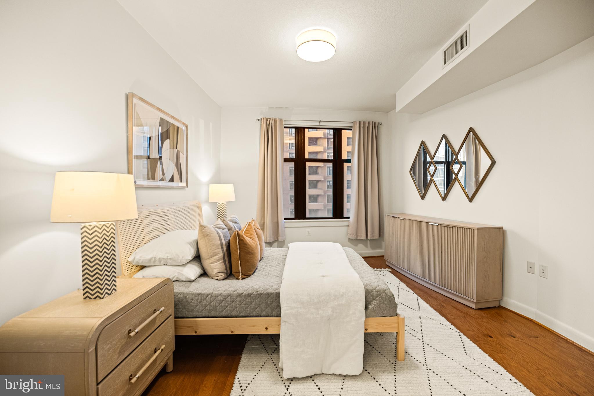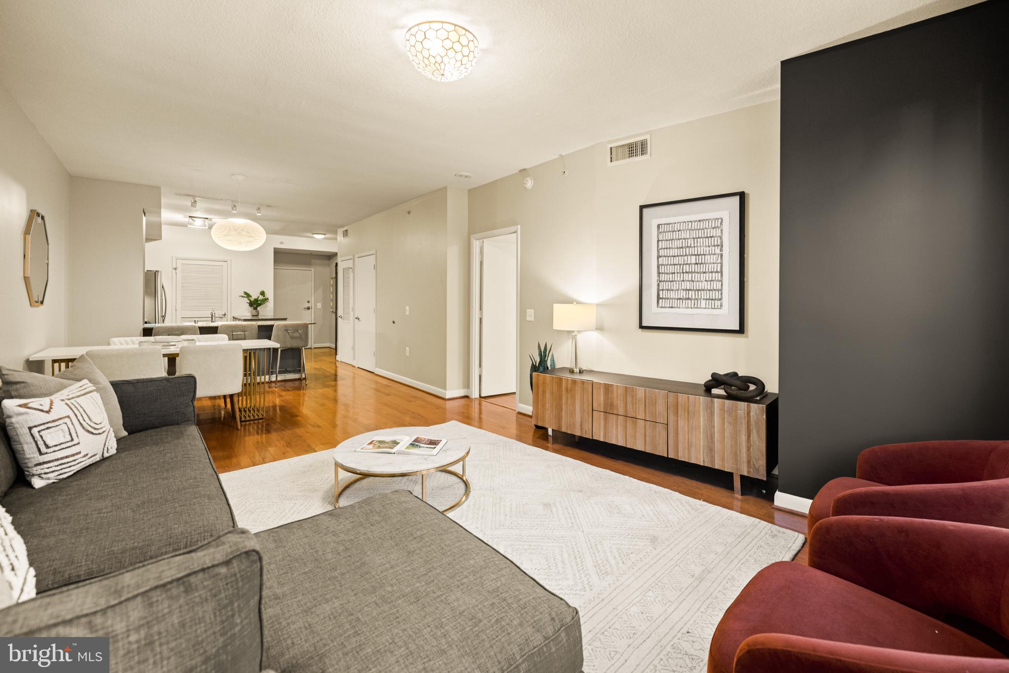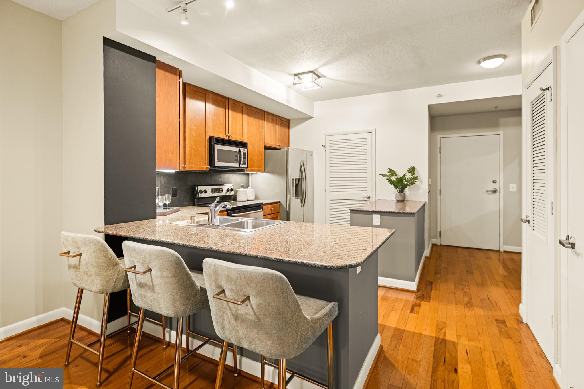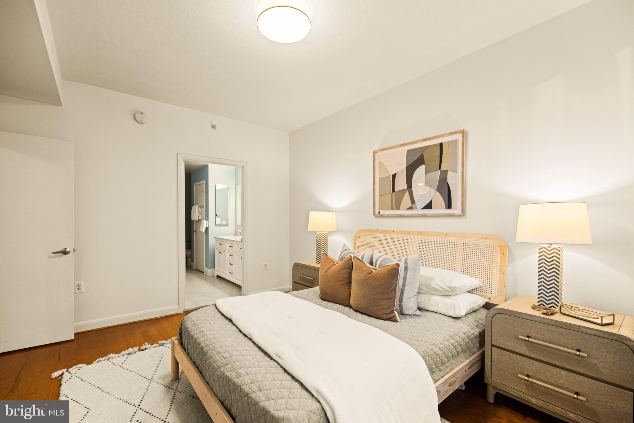 400 Mass Ave Condos | 1 Bed | 1 Den | 1 Bath | 975 Sf | 1 Garage Parking Space | Building: Built in 2005, 256 Units, Full-Time Concierge, 3 Elevators, Community Room, Fitness Center, Rooftop Pool, Business Center | Unit: Open Living Layout, Large Windows w/ Lots of Natural Light, Massive Walk-In Closet in Primary Bedroom, Office/2nd Bedroom w/ Sliding Barn Doors, Hardwood Flooring Throughout, Full-Size Washer & Dryer | Kitchen: Peninsula Island w/ Storage & Seating for 3, Additional Peninsula Island/Prep Station w/ Storage, Ample Built-In Cabinetry, Granite Countertops, Stainless Steel Appliances, French Door Refrigerator w/ Water/Ice Dispenser, Full-Size Dishwasher, Stainless Steel Double Basin Sink | Bath: Jack & Jill Bathroom, Frameless-Glass Enclosed Sliding Shower Door w/ Marble Tile Walls, Large Marble Topped Double Vanity w/ Storage, Mirrored Medicine Cabinets