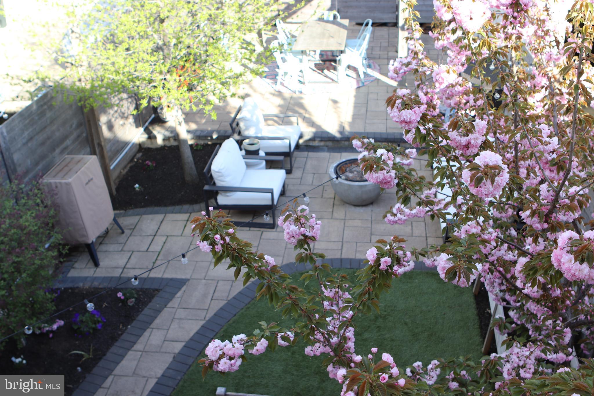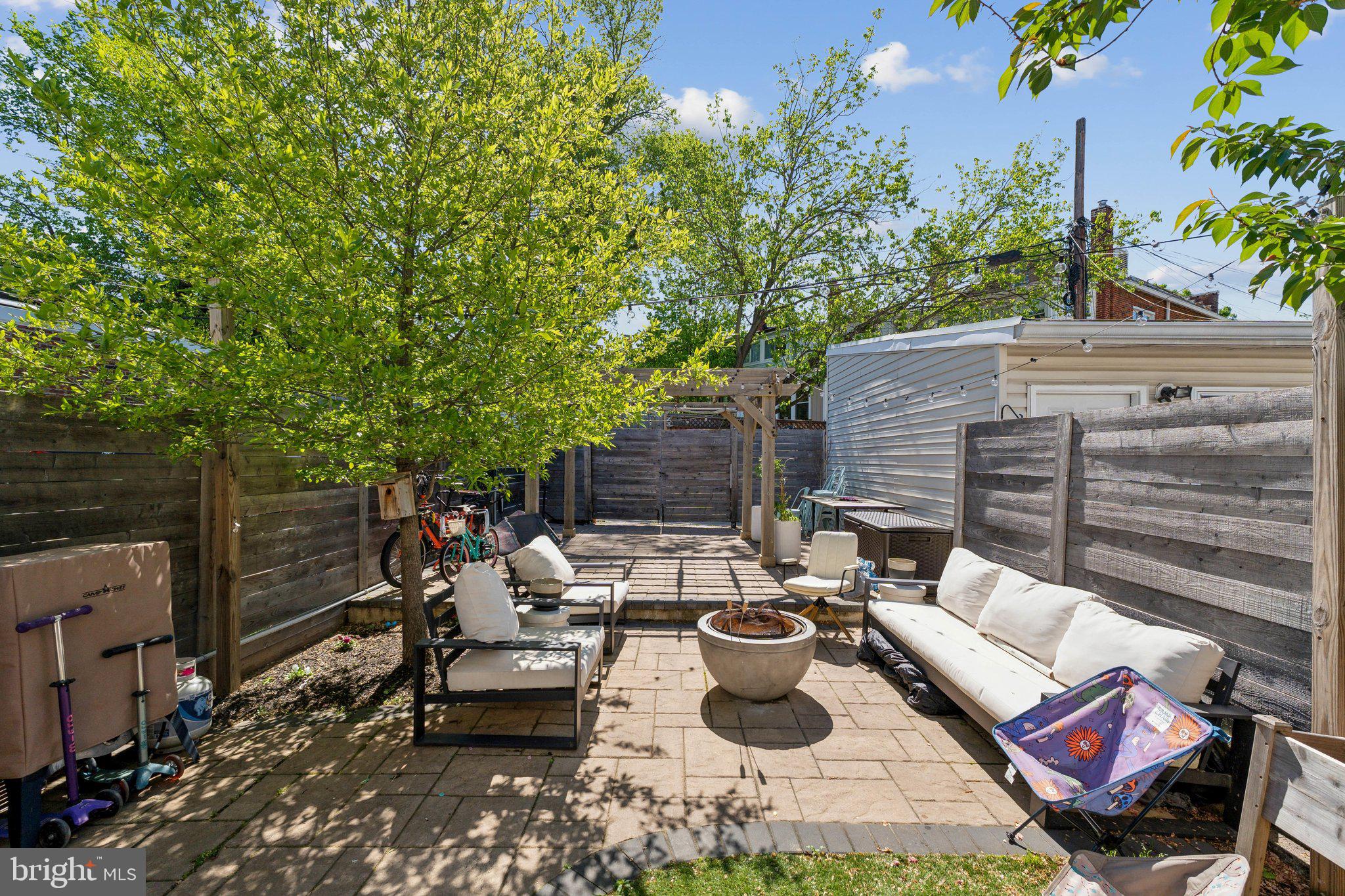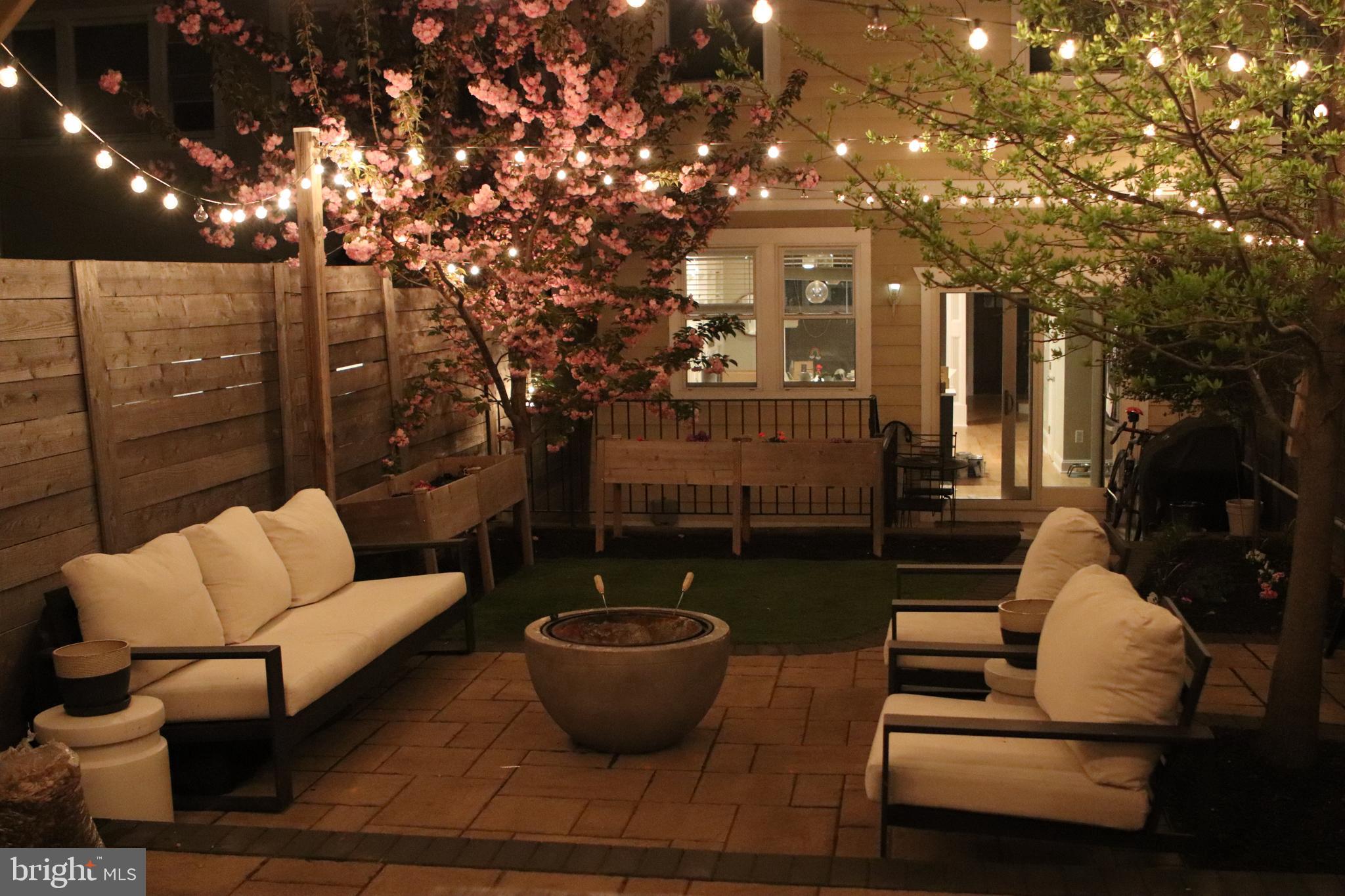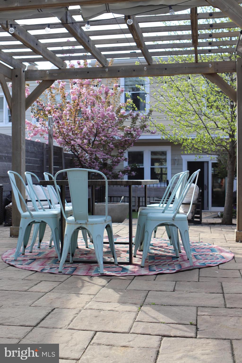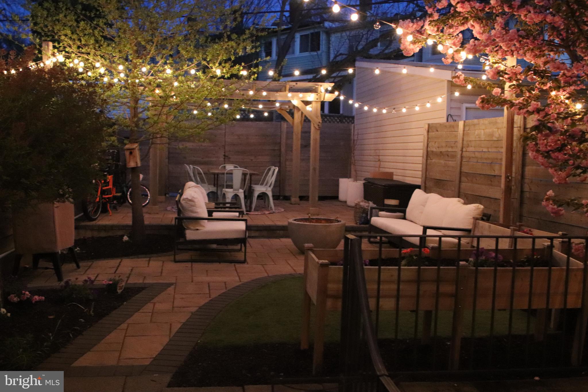 Outside, a beautifully landscaped backyard presents an oasis of tranquility and charm. Enjoy outdoor dining or relaxation under the pergola, with enchanting overhanging lights adding a magical touch. The hardscaped areas and lush turf grass complete this backyard haven, offering a perfect backdrop for outdoor enjoyment.