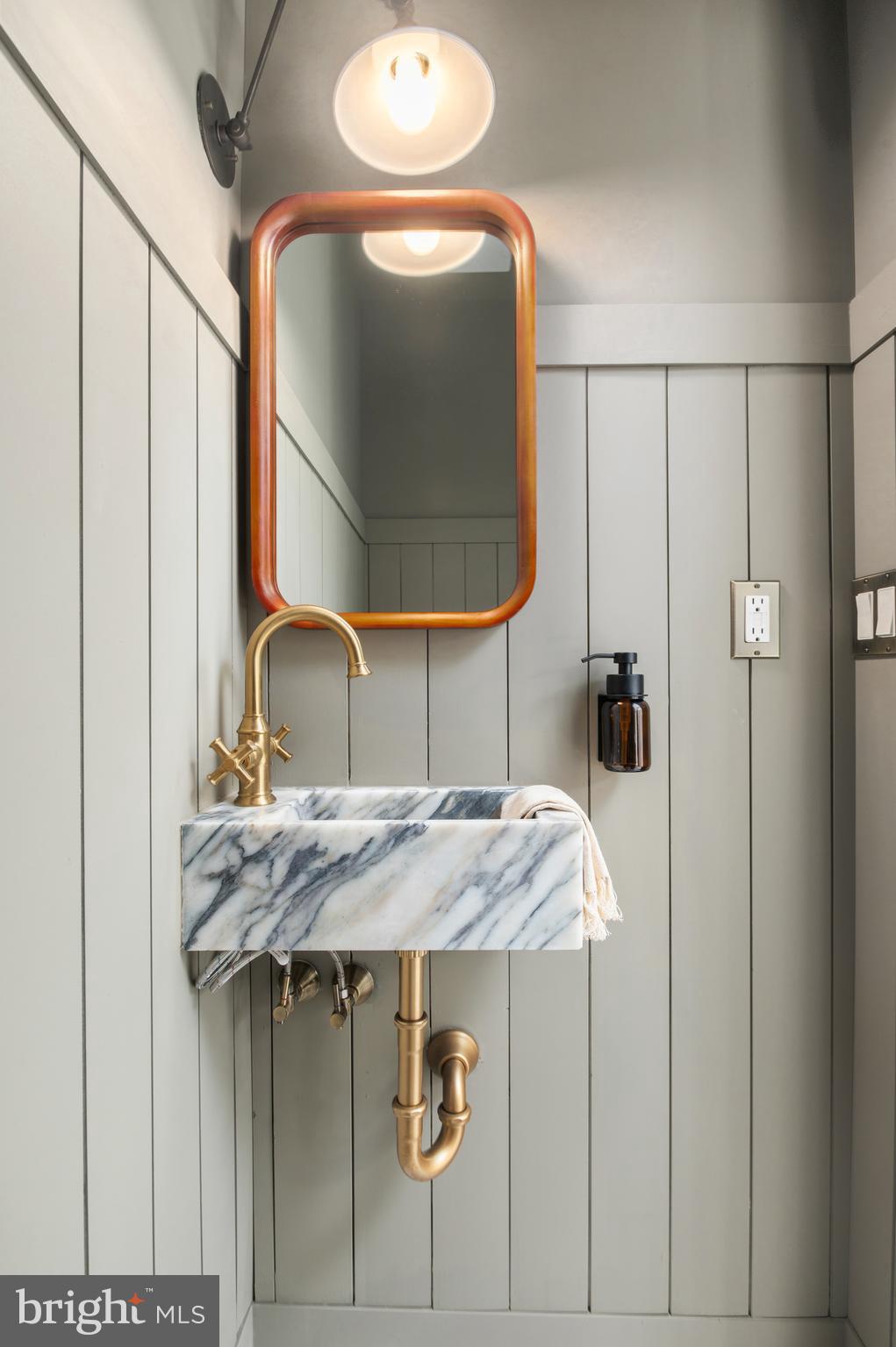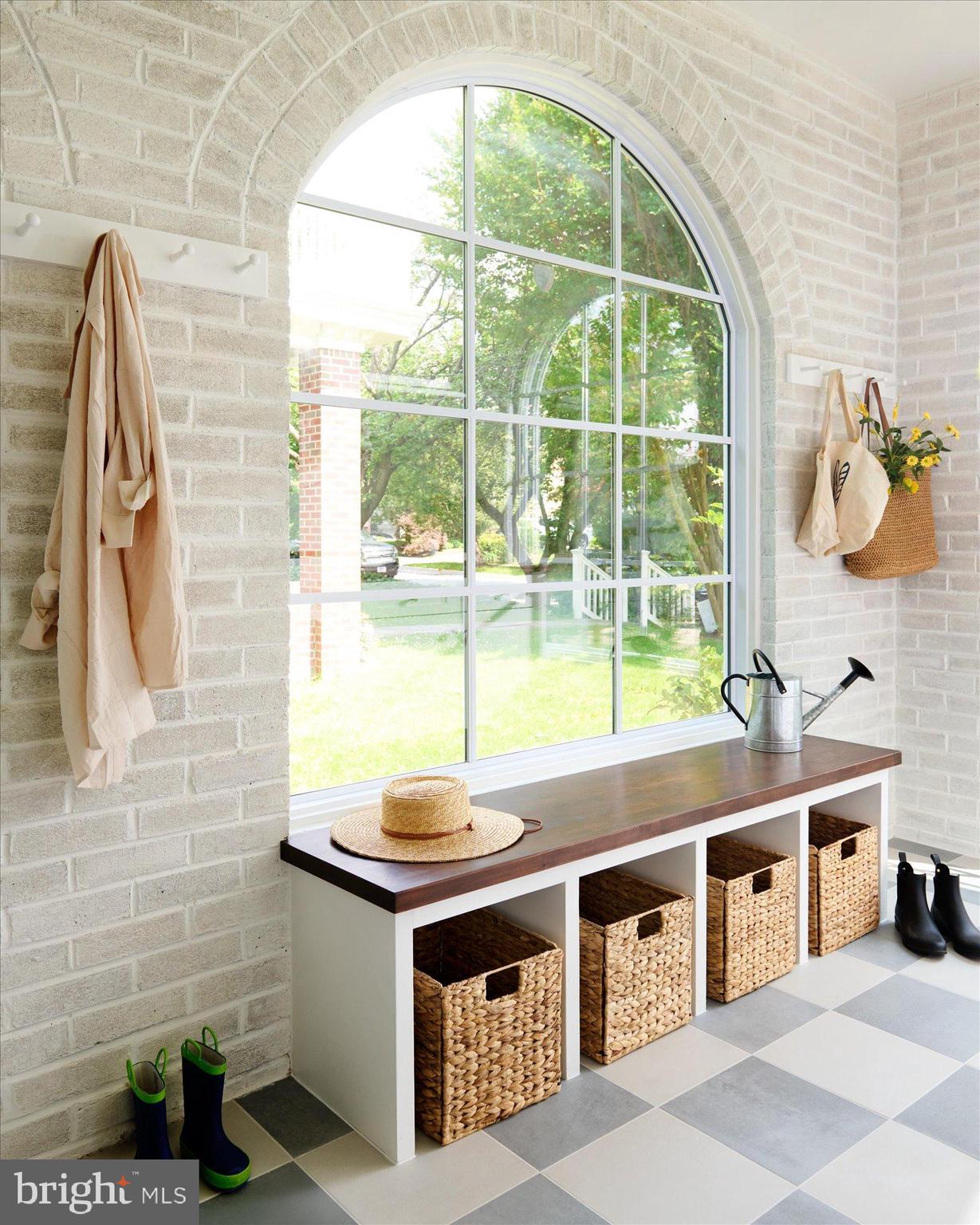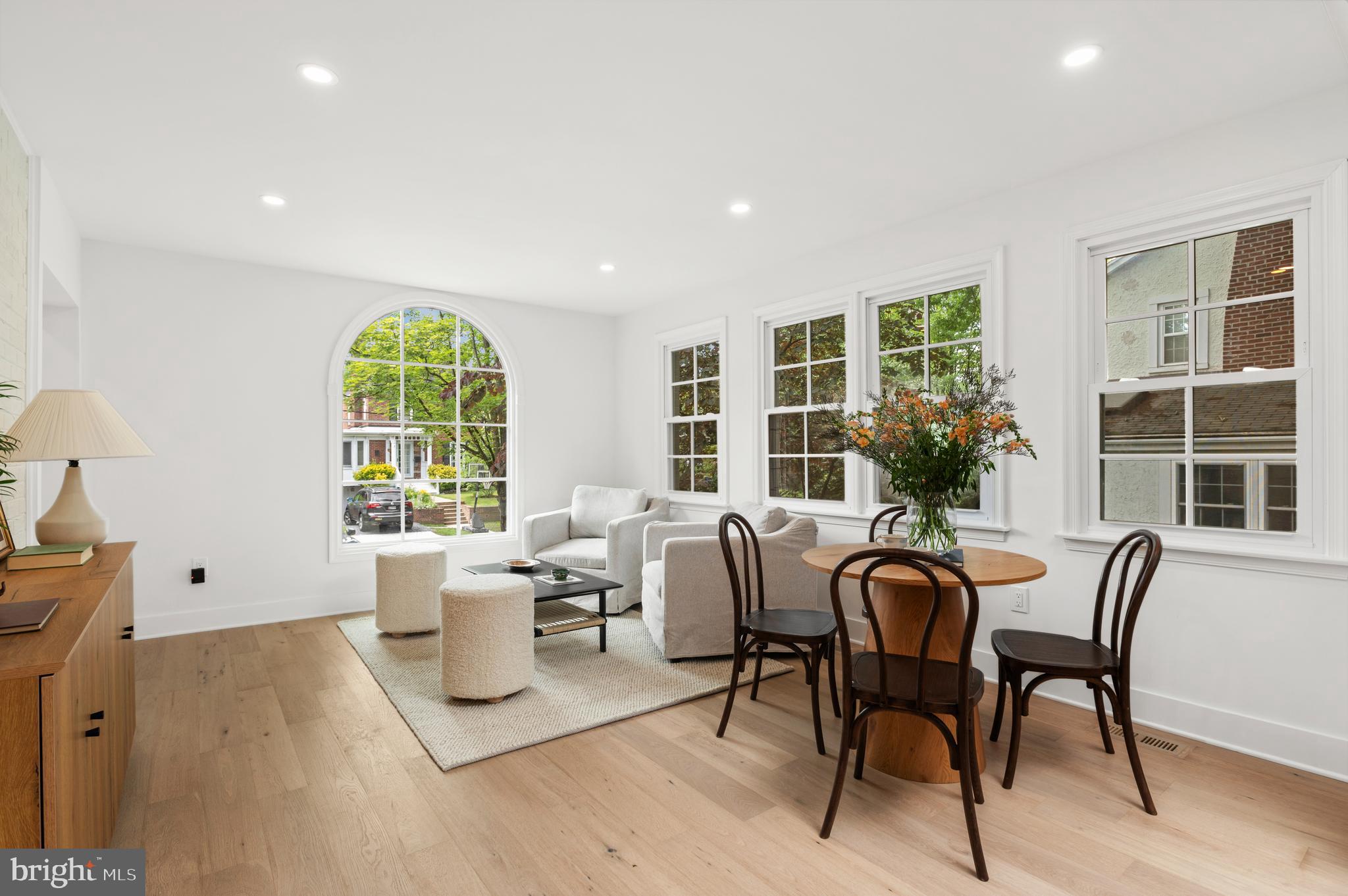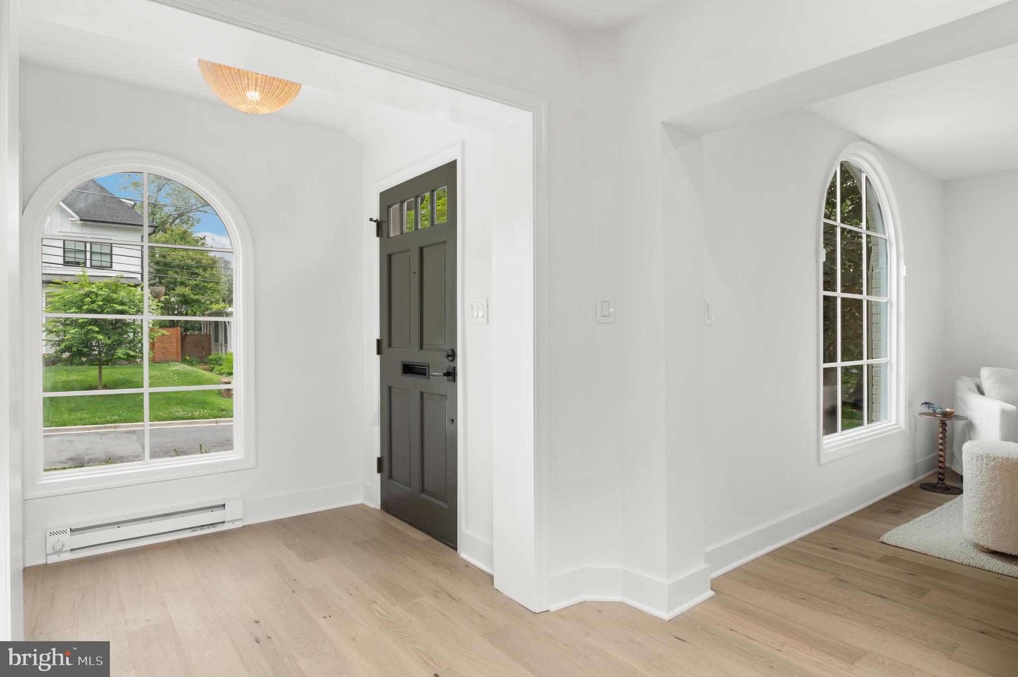 When you arrive, you're greeted by European wide plank oak floors and an inviting entrance foyer that has an oversized arched window with sunlight streaming in. Through to the living room, there is ample seating space for entertaining as well as a restored wood-burning fireplace with marble detail. Adjacent is the dining room, perfect for everyday dining or lavish dinner parties. The gourmet chef's eat-in kitchen is skylit and opens into a breakfast / family room. The kitchen has designer selected cabinetry and hardware, as well as a large walk-in pantry and separate coffee or dry bar area. From the imported Italian Porcelain countertops and floating shelves to the luxury suite of top-of-the-line appliances, this kitchen is beyond your wildest dreams. It has a large walnut stained wood island with stool seating for 4 and a gorgeous custom drywall hood with millwork. In the breakfast / family room you will notice another oversized arched window that is a perfect place for your morning coffee with room for a tv area as well as a breakfast table. A sitting room or home office as well as a large first floor bedroom with a full windowed bathroom that has a dual vanity, and walk-in shower provides a great option for a guest suite. Also on this floor is the most charming and thoughtfully designed mudroom / laundry room (with a side entrance) that has two oversized arched windows, a built-in bench with storage and powder bathroom.