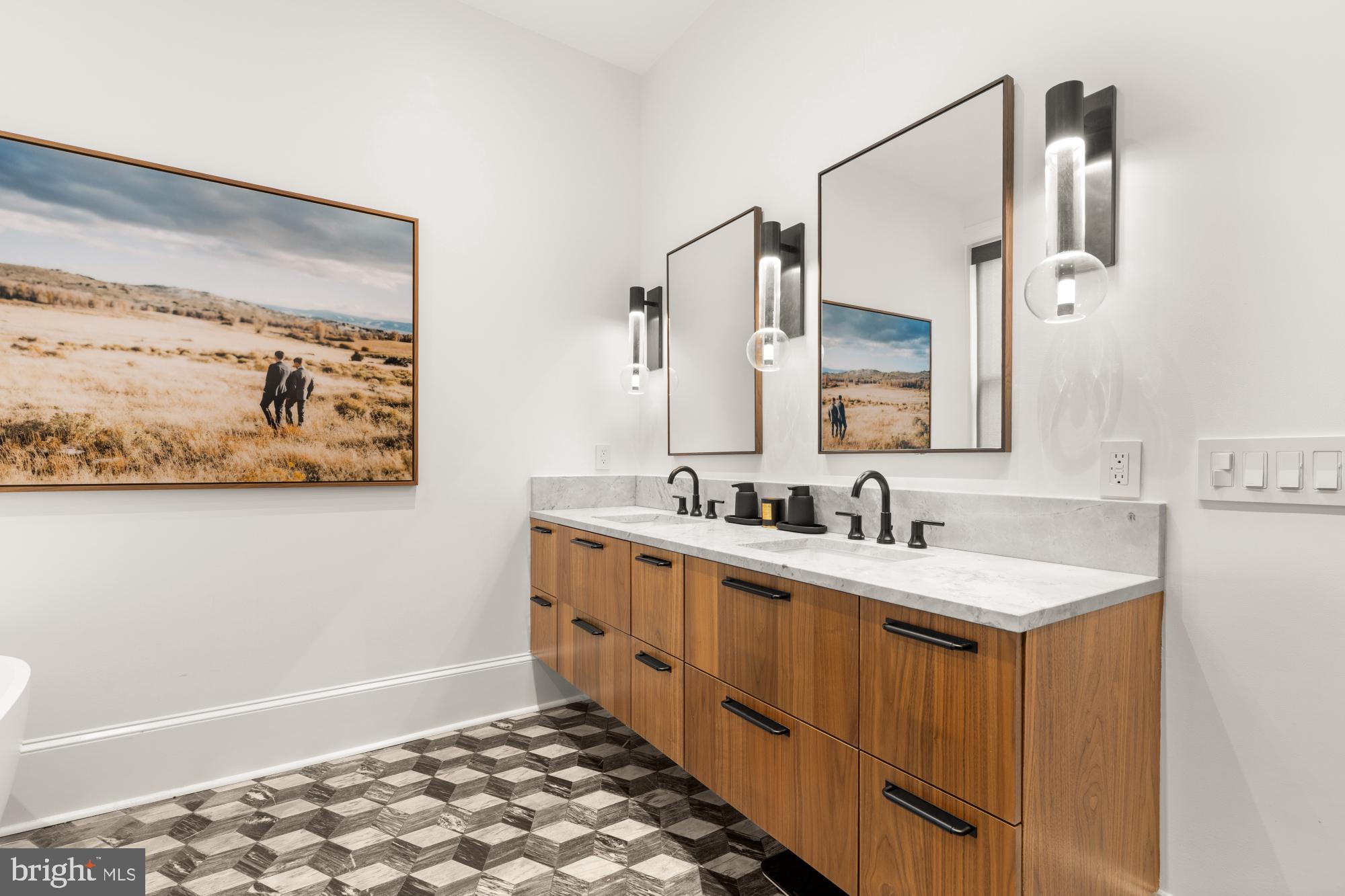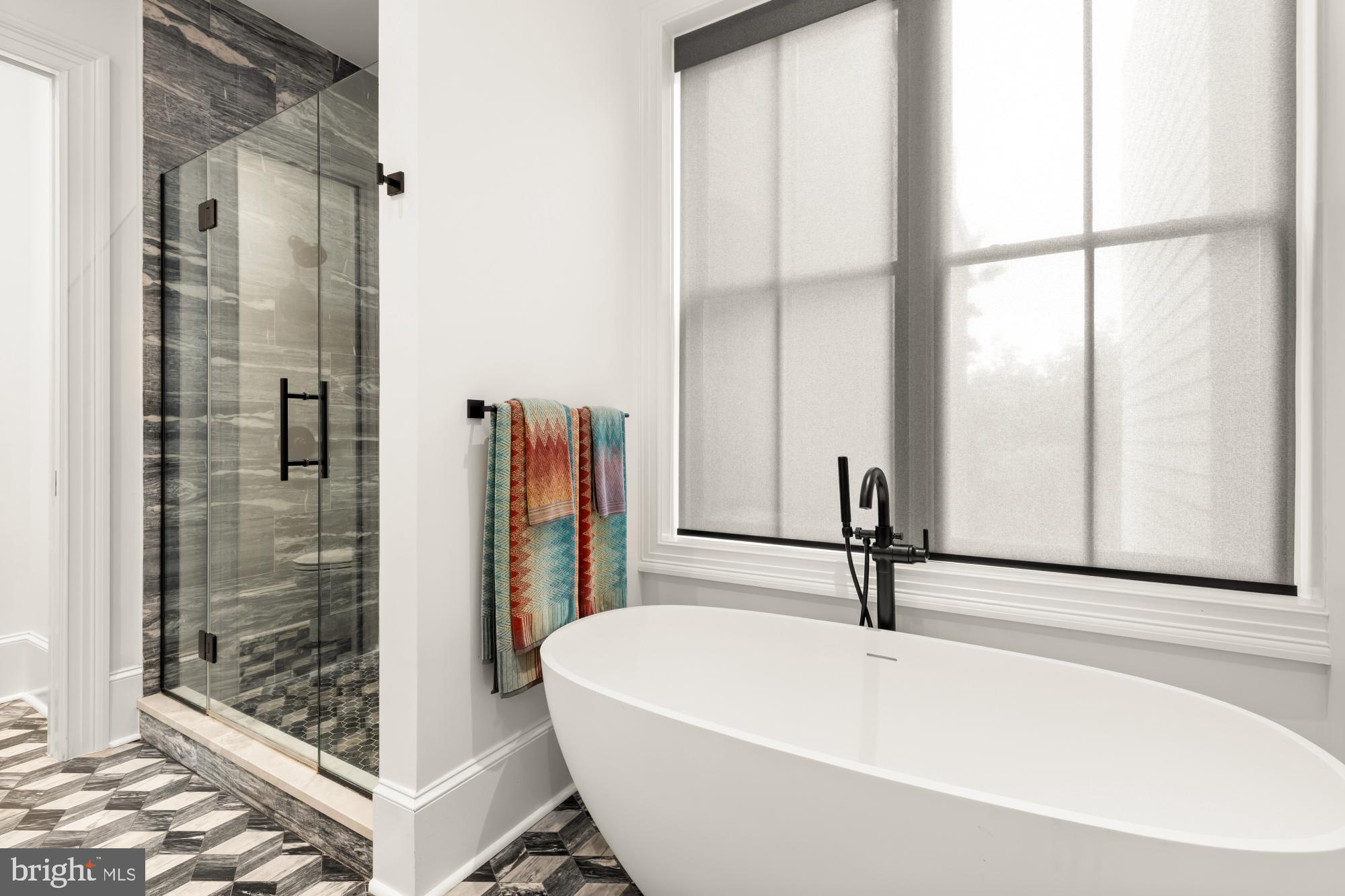 The primary suite is a private sanctuary, featuring a dedicated entrance hall, custom walk-in closet, separate office, and a spa-inspired bath with heated floors, freestanding soaking tub, oversized shower, double vanity, and private water closet.